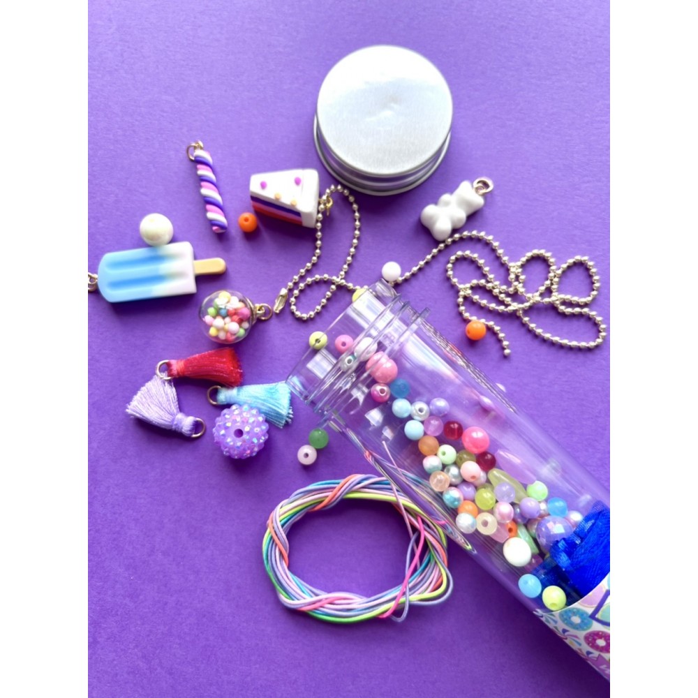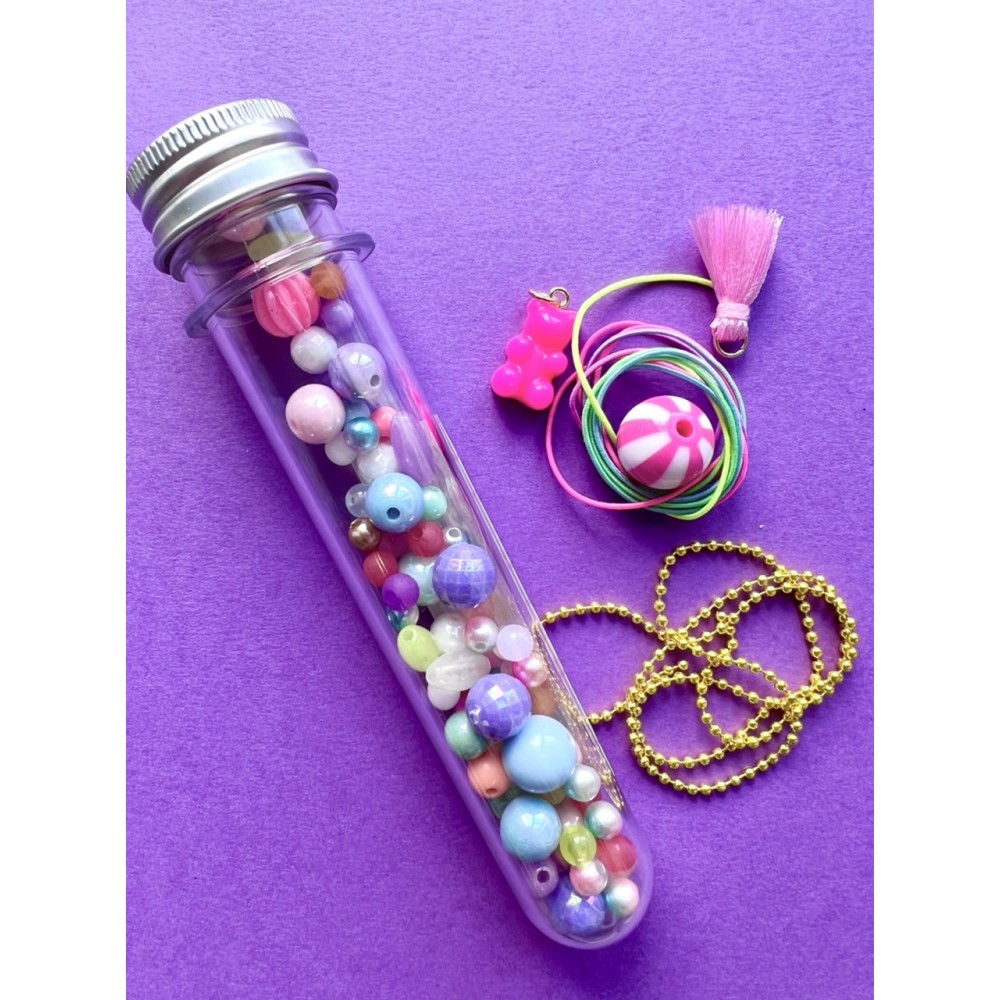Superkule rør stappfulle av fargerike perler, mix av charms/anheng, dusker, strikk og lenke til kjede og armbånd. Røret kan senere brukes til å oppbevare smykkene i, eller gjenbrukes til å fylle med blyanter,...