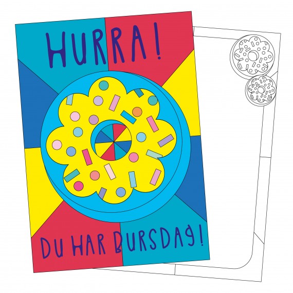 Enkle fargerike bursdagskort uten konvolutt og med matt overflate. På baksiden av kortene er det små illustrasjoner som kan fargelegges, enten av den som gir, eller den som får kortet!