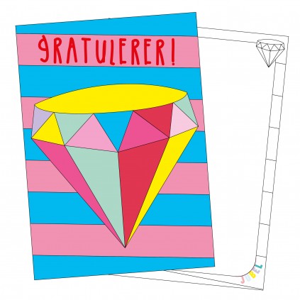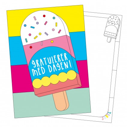 Enkle fargerike bursdagskort uten konvolutt og med matt overflate. På baksiden av kortene er det små illustrasjoner som kan fargelegges, enten av den som gir, eller den som får kortet!