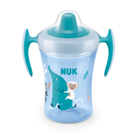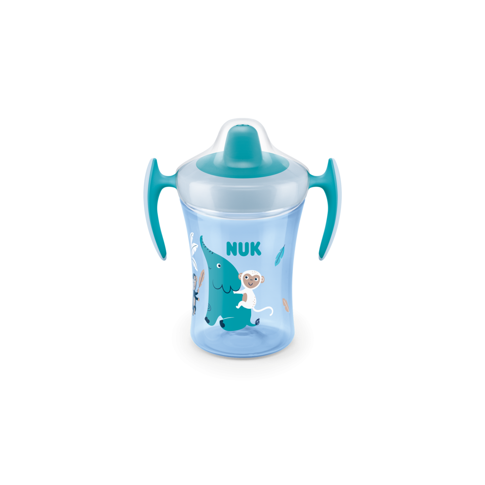 NUK Trainer tutekopp er en sølefri tutekopp med myk tut som er behagelig mot barnets tannkjøtt. Integrert luftventil lar barnet drikke uavbrutt.