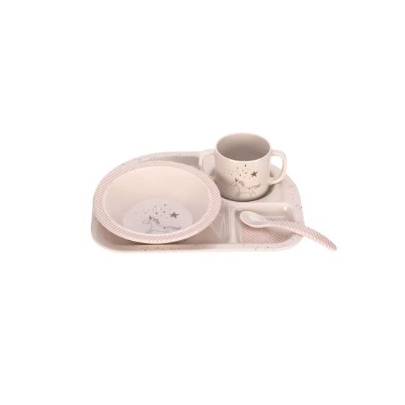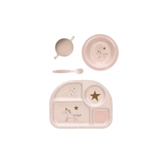 Rosa spisesett fra Lässig med hestemotiv. Består av tallerken, kopp, skje og dyp tallerken.